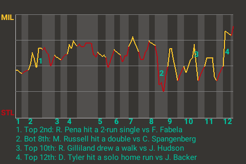 D.J. Tyler came through with a big-time hit for Milwaukee. The designated hitter smacked a solo home run in the top of the 12th inning to give his team the lead, 4-3. It was his only hit, but it was clutch.