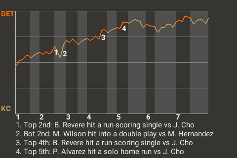 The Tigers had to work out of trouble in the bottom of the ninth. The score was 5-3, Detroit, with two out. Kansas City, with runners on 1st and 2nd, was mounting a threat. Andy Medina dug in at the plate, but on a 1-2 fastball, he popped out.