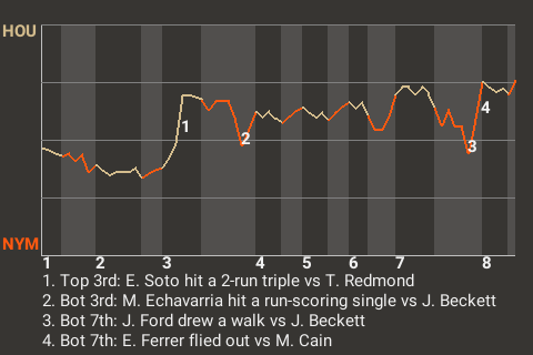 The Astros got a big at-bat from third baseman Edgar Soto. For the game, Soto went 1-4 with a triple, while adding 2 RBI and scoring once. In the top of the third, with runners on 1st and 2nd, he stroked a 2-run triple. His 4th triple of the season gave Houston a 2-1 lead.