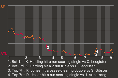With Atlanta leading 1-0 in the bottom of the third, Hartling came up to bat against San Francisco pitcher Chase Ledgister. Hartling hit a fastball to right-center for a 2-run triple. His 2nd triple of the season put the Braves on top, 3-0.