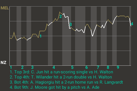 With Melbourne leading 2-0 in the top of the fourth, Wilander came up to bat against New Zealand pitcher Hayden Walton. Wilander hit a fastball to center for a 2-run double. His 3rd double of the season put the Kangaroos on top, 4-0.