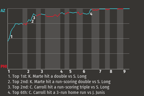 With Arizona leading 5-1 in the top of the sixth, Carroll batted against Philadelphia pitcher Jakob Junis. Carroll hit a fastball to left-center for a 3-run home run. His 17th home run of the season put the Diamondbacks on top, 8-1.